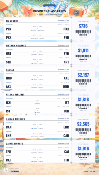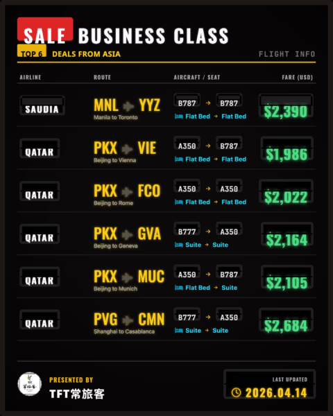 下次旅程的起點 從這裡開始 從這裡開始 讓旅程更完美 Search 今日焦點 【2026.04.16】亞洲出發最新促銷商務艙機票特輯|6 張商務艙優惠整理:開羅、倫敦、雪梨、奧克蘭、伊斯坦堡、北京 閱讀更多 » 2026-04-16 【2026.04.15】亞洲出發最新降價商務艙機票特輯|台北上海1.5萬、福岡新加坡2.6萬、香港飛卡薩布蘭卡7.4萬 閱讀更多 » 2026-04-14 【2026.04.14】亞洲出發最新降價商務艙機票特輯|6 張精選優惠票整理,北京、上海、馬尼拉出發飛歐洲/北非/北美 閱讀更多 » 2026-04-13 【2026.04.12】亞洲出發便宜商務艙機票特輯|6 張精選優惠整理:巴黎、西雅圖、慕尼黑、布里斯本、峇里島、北京 閱讀更多 » 2026-04-12 【2026.04.11】亞洲出發便宜商務艙機票特輯|5 張優惠票價整理:多倫多、溫哥華、尼斯、墨爾本、峴港一次看 閱讀更多 » 2026-04-11 2026 日本暑假跟團推薦|今年最值得報名的 6 條親子日本團體旅遊路線 閱讀更多 » 2026-04-10 【2026.04.10】亞洲出發便宜商務艙機票特輯|8 張精選優惠整理,最低 4.4 萬飛伊斯坦堡、7.4 萬飛洛杉磯 閱讀更多 » 2026-04-10 【2026 上野美食散策】10 間 Tabelog 百名店:尋覓歲月沉澱的味覺風景(附google地圖) 閱讀更多 » 2026-04-09 【2026.04.08】亞洲出發商務艙優惠機票特輯|5 張精選優惠整理:馬爾地夫、卡薩布蘭卡、芝加哥、香港、奧克蘭一次看 閱讀更多 » 2026-04-08 【2026.04.07】亞洲出發便宜商務艙機票特輯|10 張飛歐洲、非洲、北美優惠票整理,最低 2 萬出頭起 閱讀更多 » 2026-04-07 【2026.04.06】韓國出發特價商務艙特輯|馬德里 5.8萬元、墨爾本 6.2萬元,11 張優惠機票一次看 閱讀更多 » 2026-04-06 2026.04.05|日本出發便宜商務艙機票特輯|大阪飛歐洲 5.5 萬起,東京飛阿姆斯特丹 5.6 萬起,馬爾地夫 6 萬出頭也能入手 閱讀更多 » 2026-04-05 【2026東京住宿】東急Stay澀谷惠比壽開箱:房內洗衣機、惠比壽站出站 1 分鐘到飯店、最低價 NT$3,994 訂房攻略 閱讀更多 » 2026-04-04 2026.04.03|台灣出發便宜商務艙機票特輯|歐洲5.5萬起、阿提哈德飛巴黎倫敦體驗A380巨無霸客機、飛紐約達美A350個人套房促銷 閱讀更多 » 2026-04-03 大阪心齋橋 姿 萬豪系列酒店開幕|平價入住萬豪新品牌,交通、房價分析與訂房攻略 閱讀更多 » 2026-04-02 2026.4.1| 東南亞出發低價商務艙機票特輯|巴黎、倫敦 5 萬出頭,奈洛比看野生動物、塞席爾頂級海島度假,還可搭 A380 與 A350 個人座艙 閱讀更多 » 2026-04-01 大陸港澳出發平價商務艙機票特輯|2026.3.31|阿提哈德香港飛阿姆斯特丹TWD 5.5 萬起,卡達北京飛華沙 TWD 6.6 萬起 閱讀更多 » 2026-03-31 【2026.03.30】韓國出發商務艙優惠整理|首爾飛馬德里 5.5 萬、倫敦 5.6 萬、米蘭 5.5 萬,釜山飛奧克蘭 6.2 萬起 閱讀更多 » 2026-03-30 2026.03.28|從台灣飛歐洲商務艙不到 6 萬!9 張高 CP 值優惠機票:巴黎、倫敦、東京羽田、峇里島、北美 閱讀更多 » 2026-03-28 【2026福岡新酒店】福岡王子大飯店百道濱開箱!全室海景、互動AR藝術、訂房優惠攻略 閱讀更多 » 2026-03-28 全部文章 編輯精選 熱門話題 【2026.04.16】亞洲出發最新促銷商務艙機票特輯|6 張商務艙優惠整理:開羅、倫敦、雪梨、奧克蘭、伊斯坦堡、北京 【2026.04.15】亞洲出發最新降價商務艙機票特輯|台北上海1.5萬、福岡新加坡2.6萬、香港飛卡薩布蘭卡7.4萬 【2026.04.14】亞洲出發最新降價商務艙機票特輯|6 張精選優惠票整理,北京、上海、馬尼拉出發飛歐洲/北非/北美 【2026.04.12】亞洲出發便宜商務艙機票特輯|6 張精選優惠整理:巴黎、西雅圖、慕尼黑、布里斯本、峇里島、北京 【2026.04.11】亞洲出發便宜商務艙機票特輯|5 張優惠票價整理:多倫多、溫哥華、尼斯、墨爾本、峴港一次看 【2026.04.10】亞洲出發便宜商務艙機票特輯|8 張精選優惠整理,最低 4.4 萬飛伊斯坦堡、7.4 萬飛洛杉磯 全部編輯精選文章