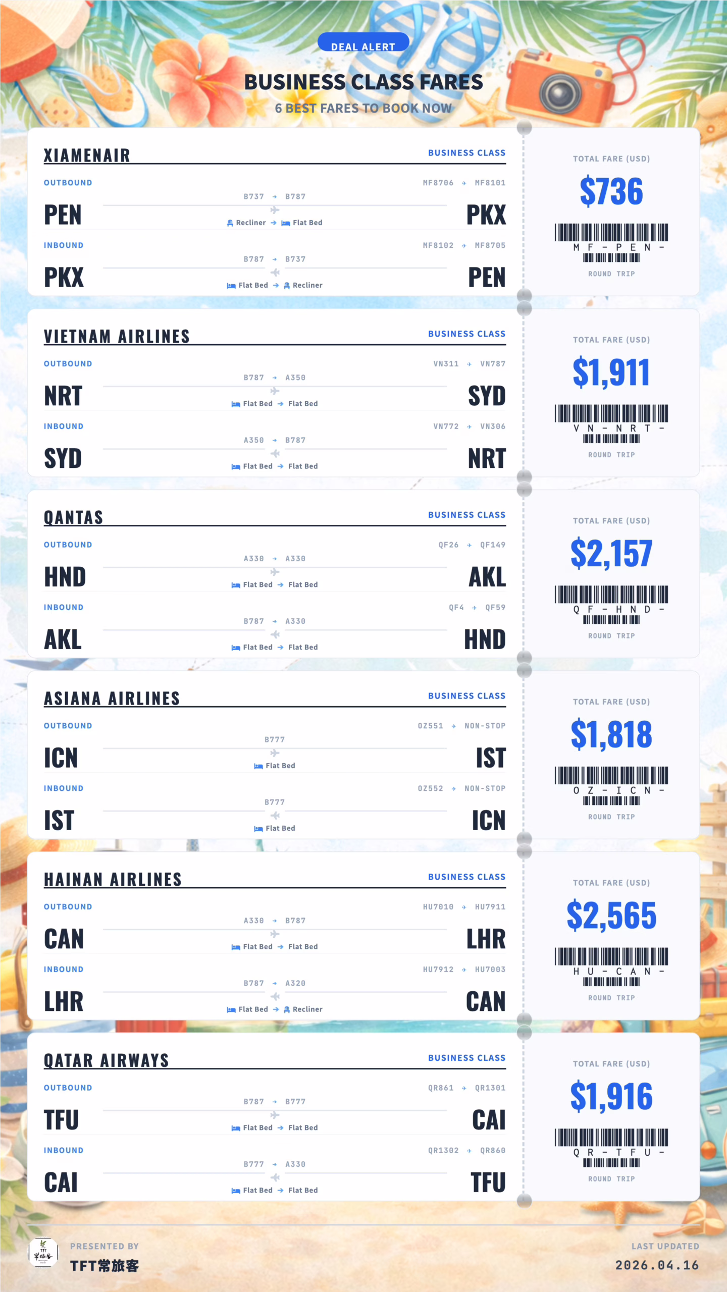 亞洲出發最新促銷商務艙優惠機票特輯【2026.04.16】|6 張優惠票一次整理,從北京到雪梨到開羅都有亮點