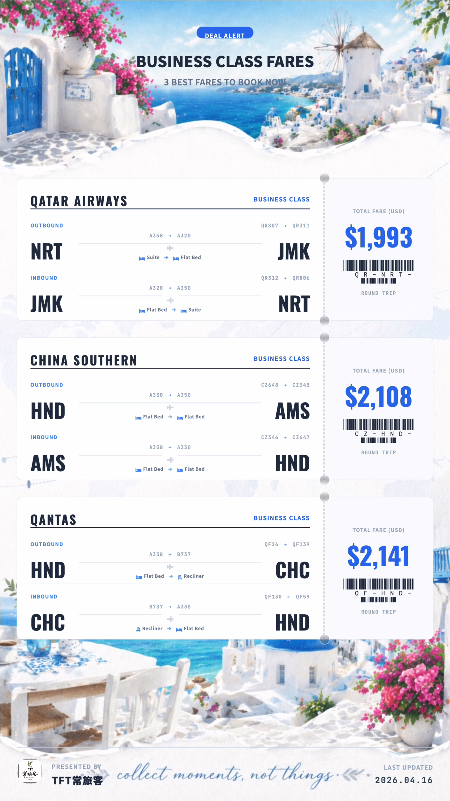 東京 ⇄ 米克諾斯(Mykonos) 商務艙來回 TWD 62,986(USD 1,993)|卡達航空(Qatar Airways)|➡️ 機票連結