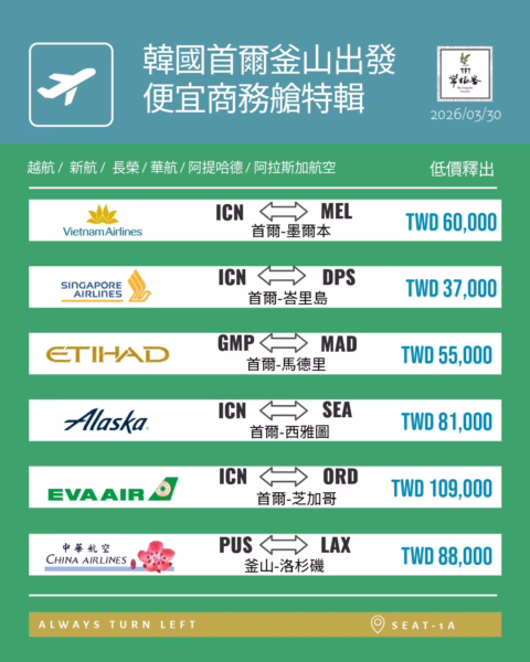 這波韓國出發商務艙優惠票價很有看頭,最亮眼的是阿提哈德航空首爾飛馬德里、倫敦、米蘭,來回約 5.5 萬~5.6 萬元;另外還有首爾飛峇里島約 3.7 萬、首爾飛墨爾本約 6 萬、釜山飛奧克蘭約 6.2 萬、釜山飛洛杉磯約 8.8 萬,以及首爾直飛西雅圖約 8.1 萬等值得留意的商務艙票。