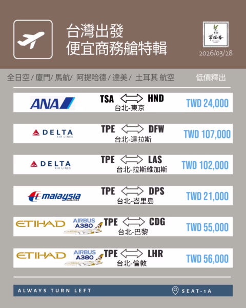 這波台灣出發商務艙機票優惠中,最值得關注的是阿提哈德航空台北飛巴黎、倫敦等歐洲線,票價明顯漂亮、長程線CP值突出;另外全日空松山直飛羽田商務艙,也很適合重視機場便利性與時間效率的旅客。本文一次整理三大聯盟與非聯盟重點票價亮點。