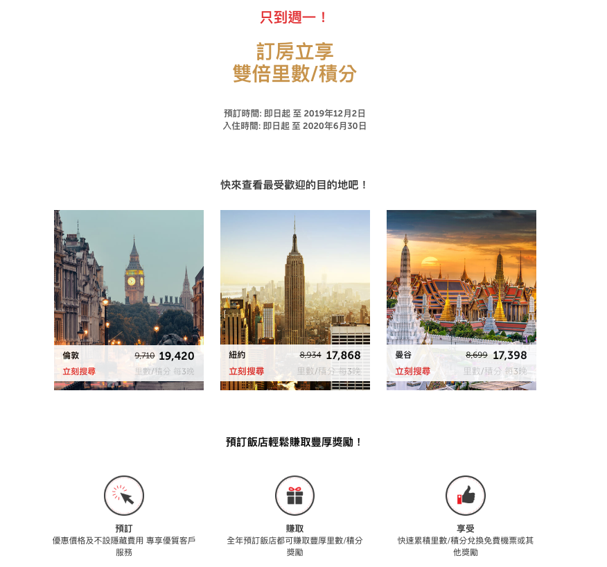 活動內容: 於2019年12月2日前(含當日)透過 https://www.kaligo.com/black-friday-sale,從全球55萬家酒店中任意選擇並預訂酒店,可從40多個航空公司常旅客計劃中進行選擇,賺取雙倍里數/積分 。