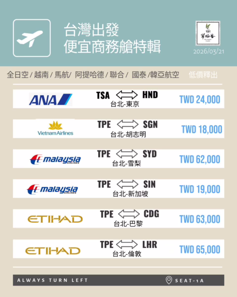 但若你的需求不是追求最低 TWD/Mile,而是想找一張實用、方便、行程效率高的商務艙,那麼松山直飛羽田仍然有它非常明確的吸引力。畢竟東京線需求長年穩定,而松山與羽田的雙核心機場組合,對不少旅客來說就是省時省力。簡單來說,這次台灣出發的商務艙票單裡,阿提哈德適合想衝歐洲長程線的人,ANA 松山-羽田則適合重視便利與效率的東京旅客,兩種需求都各有亮點。